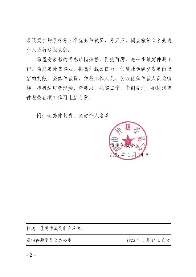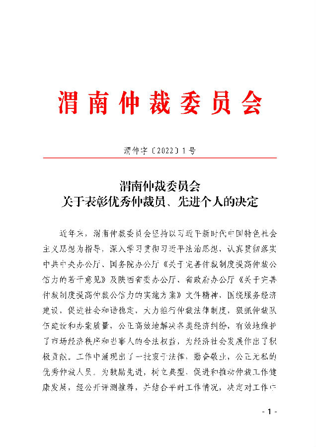 渭南仲裁委員會 關(guān)于表彰優(yōu)秀仲裁員、先進(jìn)個人的決定