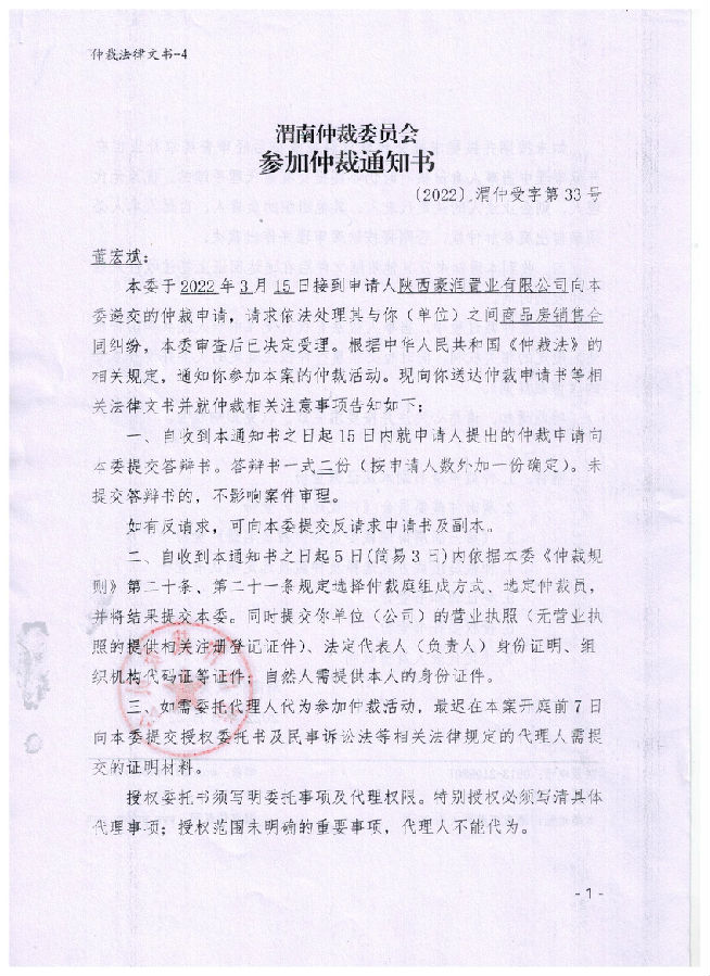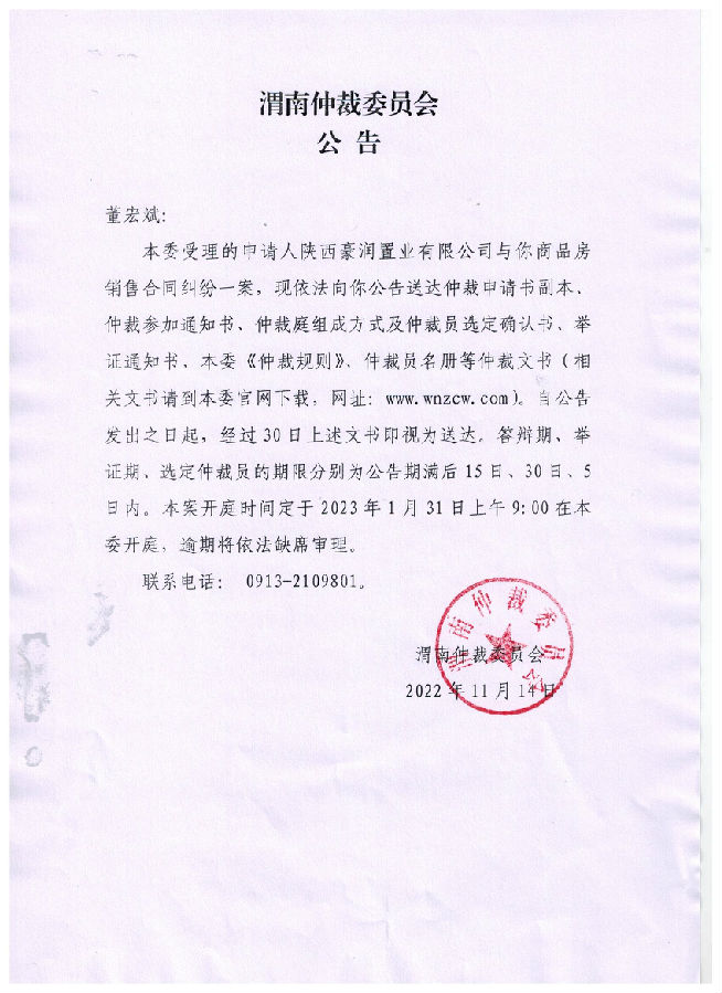 陜西豪潤置業(yè)有限公司與董宏斌一案公告