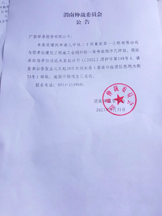 中鐵二十局集團(tuán)第一工程有限公司與廣西世澤投資有限公司一案裁決書(shū)公告