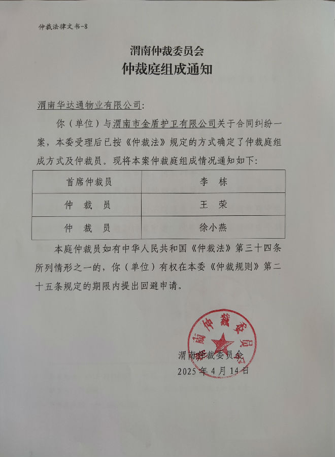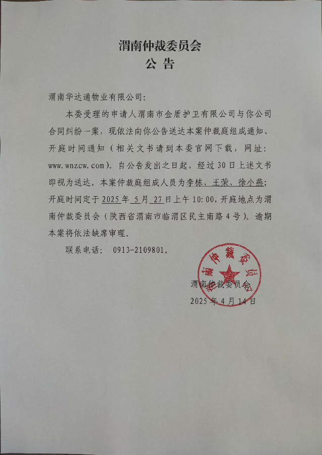渭南華達通物業(yè)有限公司與渭南市金盾護衛(wèi)有限公司合同糾紛案公告