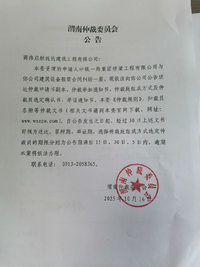 中鐵一局集團橋梁工程有限公司與商洛啟航遠達建筑工程有限公司建筑設備租賃合同糾紛案公告